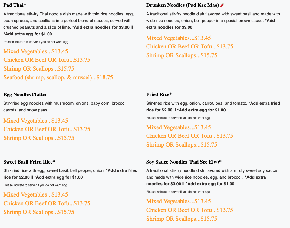 Stir-fried rice with egg, Thai basil, bell pepper, onion. Add extra fried rice and extra egg for an additional charge. Please notify us of any food allergies, as all ingredients are not listed in the menu. All food may contain some traces of peanuts.